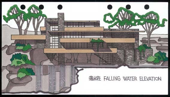 1936年以来、落水荘は、世界各国の書籍に記載され、その影響力は今の時代にも生き続けています。流れ落ちる滝の上に片持梁で張り出しているこの住居は、巨大な自然石のパイロンの中に造られ、森の樹々を通して、定版とパラペットの長い水平線が空中に浮いている様に見える、まさに建物が岩の一部に見えてしまう姿は、周囲の景観のコアに融合しきっていて、神密に感じられます。