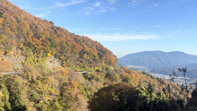 紅葉がきれいに色づく道のりを走っていると綺麗な景色に目をとられますが、猿や鹿がヒョコっと